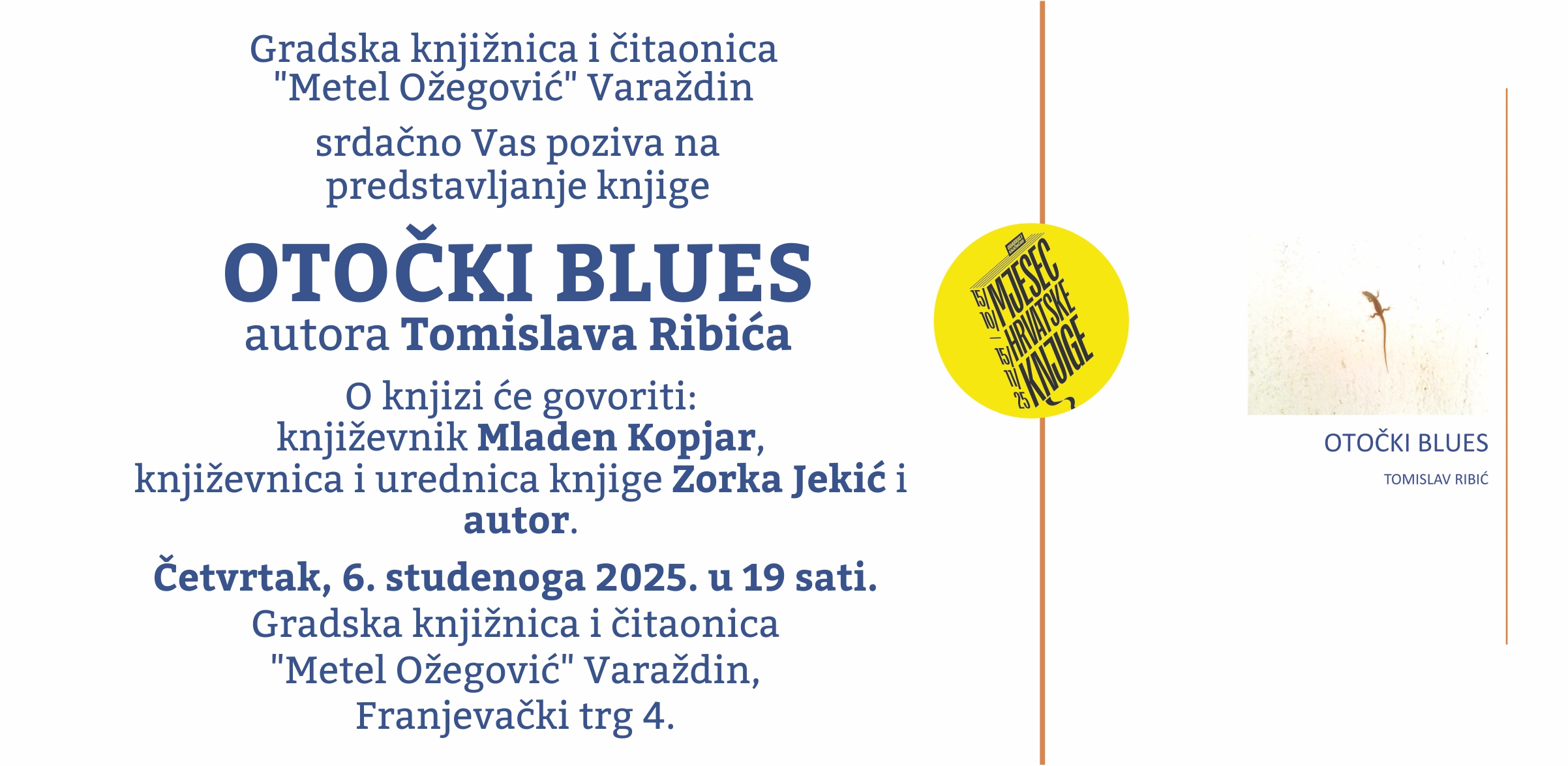 Gradska knjižnica i čitaonica "Metel Ožegović" Varaždin srdačno Vas poziva na predstavljanje knjige Otočki blues autora Tomislava Ribića. Knjigu će predstaviti književnik Mladen Kopjar, književnica i urednica knjige Zorka Jekić i autor. Četvrtak, 6. studenoga 2025. u 19 sati u Gradskoj knjižnici i čitaonici "Metel Ožegović" Varaždin, Franjevački trg 4.