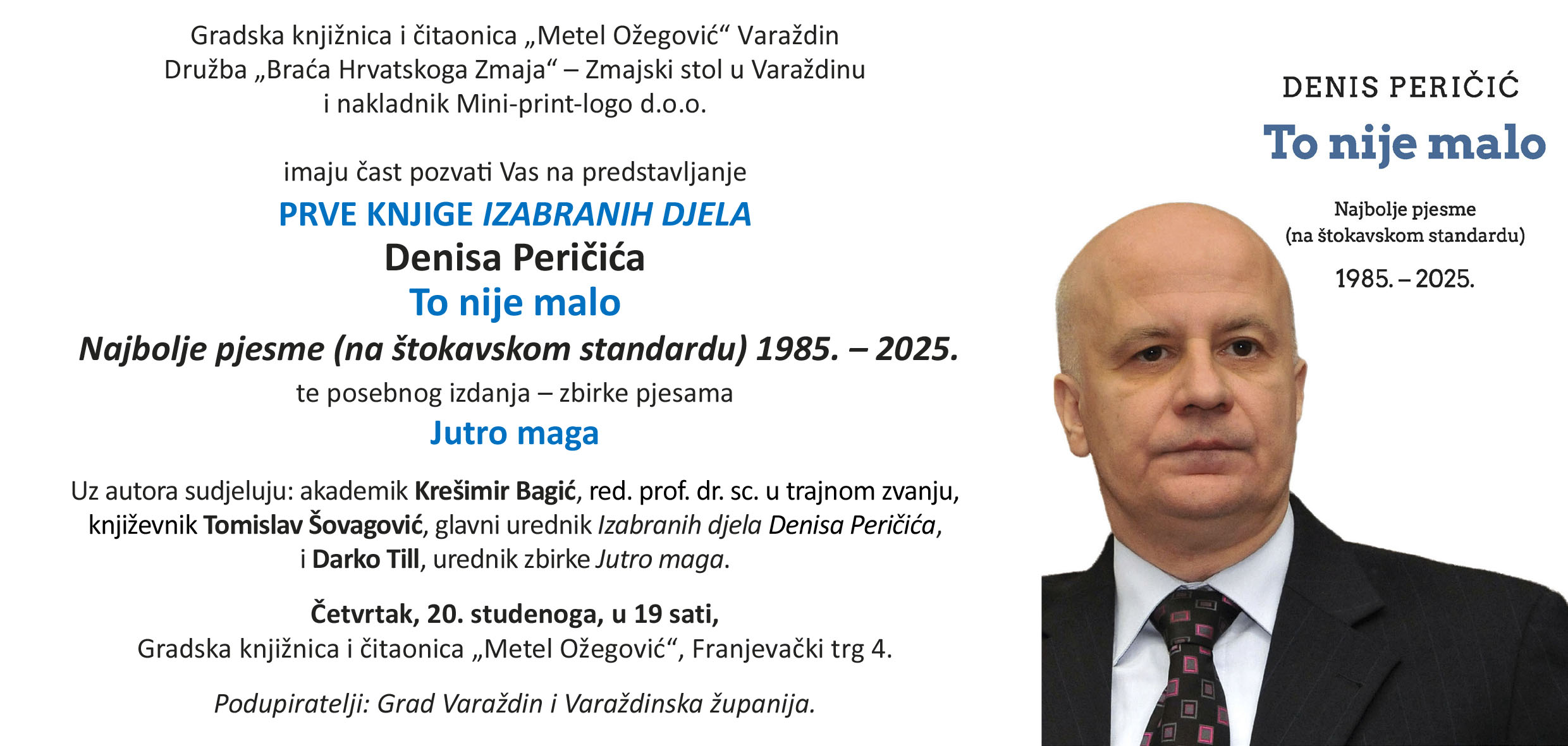 Gradska knjižnica i čitaonica "Metel Ožegović" Varaždin i Družba "Braća Hrvatskoga Zmaja" - Zmajski stol u Varaždinu i nakladnik Mini-print-logo d.o.o. imaju čast pozvati Vas na predstavljanje prve knjige Izabranih djela autora Denisa Peričića To nije malo - Najbolje pjesme (na štokavskom standardu) 1985.-2025. te posebnog izdanja - zbirke pjesama Jutro maga. Uz autora sudjeluju: akademik Krešimir Bagić, red. prof. dr. sc. u trajnom zvanju, književnik Tomislav Šovagović, glavni urednik Izabranih djela Denisa Peričića, i Darko Till, urednik zbirke Jutro maga. Četvrtak, 20. studenoga 2025. u 19 sati. Gradska knjižnica i čitaonica "Metel Ožegović" Varaždin, Franjevački trg 4. Podupiratelji: Grad Varaždin i Varaždinska županija.