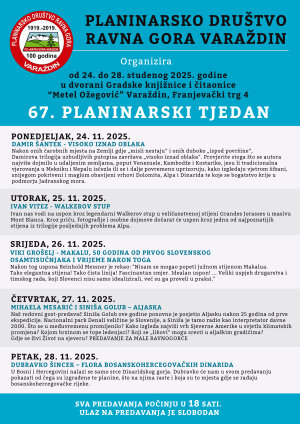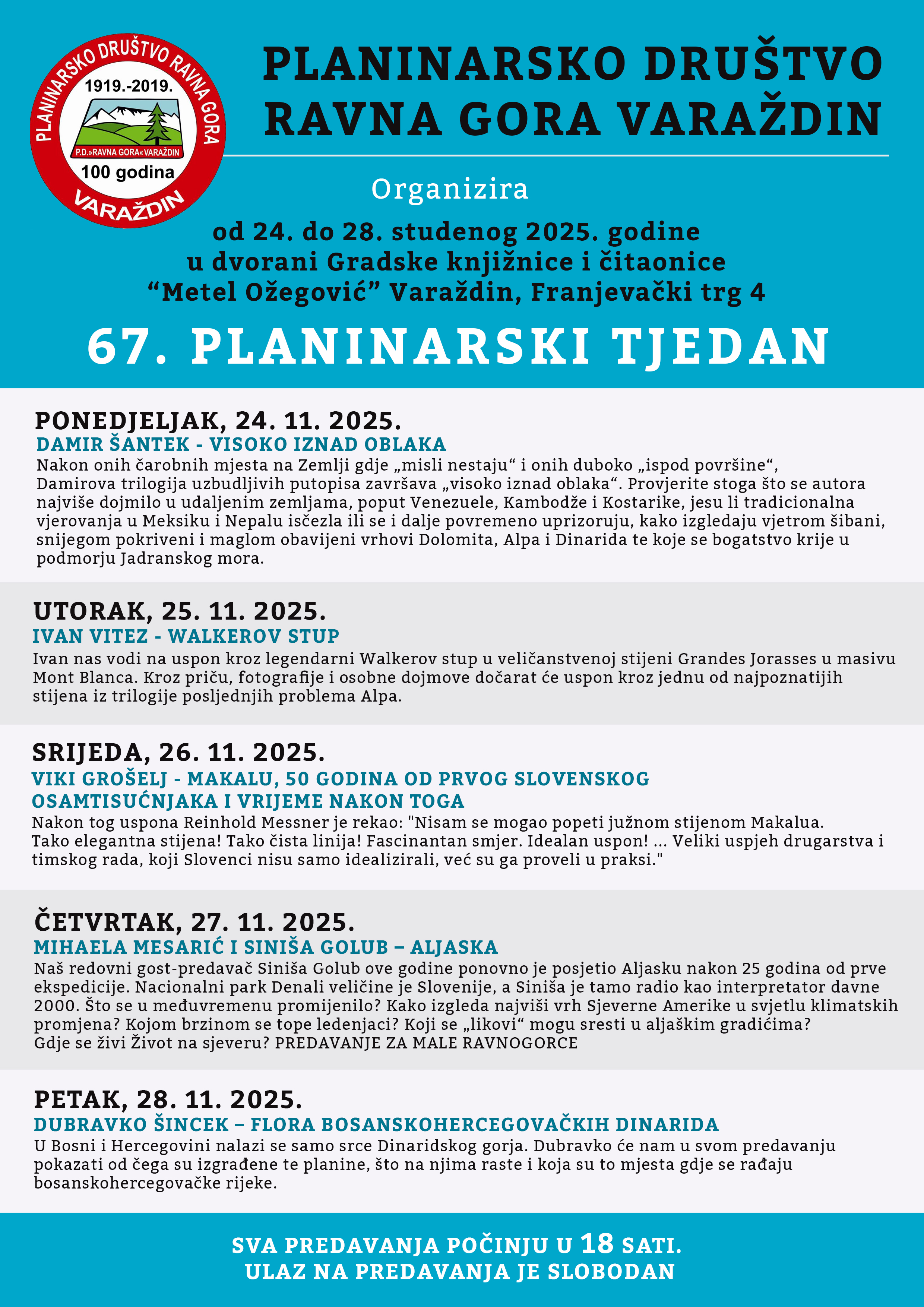 Planinarsko društvo Ravna gora Varaždin organizira 67. PLANINARSKI TJEDAN. Predavanja povodom Planinarskog tjedna održat će se u Gradskoj knjižnici i čitaonici "Metel Ožegović" Varaždin, svakodnevno od 24. do 28. studenog 2025. u 18 sati. U ponedjeljak, 24. studenoga 2025., ciklus predavanja otvara Damir Šantek predavanjem „Visoko iznad oblaka“. Nakon što nas je u svojim prethodnim putopisima poveo na čarobna mjesta gdje „misli nestaju“ i duboko „ispod površine“, Damir svoju trilogiju završava putovanjima u visine. Govorit će o udaljenim zemljama poput Venezuele, Kambodže i Kostarike, o tradicionalnim vjerovanjima koja u Meksiku i Nepalu još uvijek povremeno oživljavaju te o vjetrom šibanim, snijegom pokrivenim i maglom obavijenim vrhovima Dolomita, Alpa i Dinarida, ali i o bogatstvu koje se krije u podmorju Jadranskog mora. U utorak, 25. studenoga, Ivan Vitez će nas povesti na uspon kroz legendarni Walkerov stup u veličanstvenoj stijeni Grandes Jorasses u masivu Mont Blanca. Kroz priču, fotografije i osobne dojmove približit će doživljaj jednog od najpoznatijih alpskih uspona iz trilogije „posljednjih problema Alpa“. U srijedu, 26. studenoga, slovenski alpinist Viki Grošelj održat će predavanje „Makalu – 50 godina od prvog slovenskog osamtisućnjaka i vrijeme nakon toga“. Taj legendarni uspon Reinhold Messner je opisao kao „veliki uspjeh drugarstva i timskog rada, koji Slovenci nisu samo idealizirali, već su ga proveli u praksi“. U četvrtak, 27. studenoga, Mihaela Mesarić i Siniša Golub predstavit će predavanje „Aljaska“, u kojem će Siniša, nakon 25 godina, ponovno podijeliti dojmove s mjesta gdje je kao mladi interpretator radio u Nacionalnom parku Denali – području veličine cijele Slovenije. Govorit će o promjenama koje su se dogodile u međuvremenu, o utjecaju klimatskih promjena na ledenjake, o svakodnevici ljudi koji žive „život na sjeveru“ i o osebujnim likovima malih aljaških gradića. Petak, 28. studenoga, rezerviran je za Dubravka Šinceka i njegovo predavanje „Flora bosanskohercegovačkih Dinarida“, u kojem će nas provesti kroz samo srce Dinaridskog gorja, pokazujući od čega su te planine izgrađene, što na njima raste i gdje se rađaju rijeke Bosne i Hercegovine.