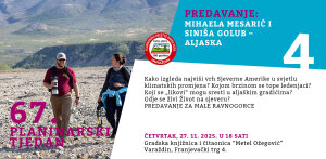 Naš redovni gost-predavač Siniša Golub ove godine ponovno je posjetio Aljasku nakon 25 godina od prve ekspedicije. Nacionalni park Denali veličine je Slovenije, a Siniša je tamo radio kao interpretator davne 2000. Što se u međuvremenu promijenilo? Kako izgleda najviši vrh Sjeverne Amerike u svjetlu klimatskih promjena? Kojom brzinom se tope ledenjaci? Koji se „likovi“ mogu sresti u aljaškim gradićima? Gdje se živi Život na sjeveru? PREDAVANJE ZA MALE RAVNOGORCE.
