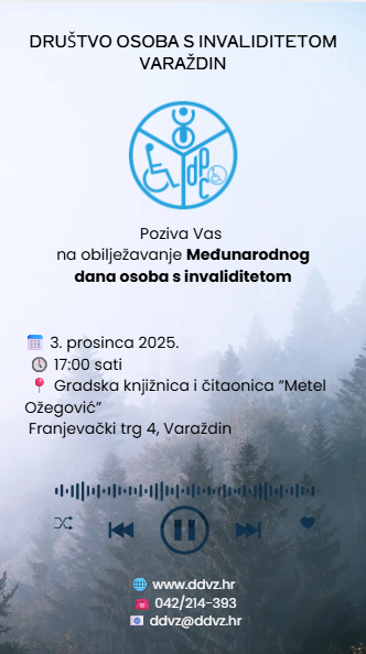 Društvo osoba s invaliditetom Varaždin i Gradska knjižnica i čitaonica "Metel Ožegović" Varaždin pozivaju Vas na obilježavanje Međunarodnog dana osoba s invaliditetom, koje će se održati 3. prosinca 2025. godine u 17:00 sati u Gradskoj knjižnici i čitaonici "Metel Ožegović", Franjevački trg 4, Varaždin. Program događanja obuhvaća: nastup novinarsko–literarne grupe „Jasminka Matoković – Jaca", tombolu za podupiruće članove, neformalno druženje i zakuska. Bit će nam iznimno drago da svojim dolaskom podržite naše aktivnosti i zajedno s nama obilježite ovaj važan dan.