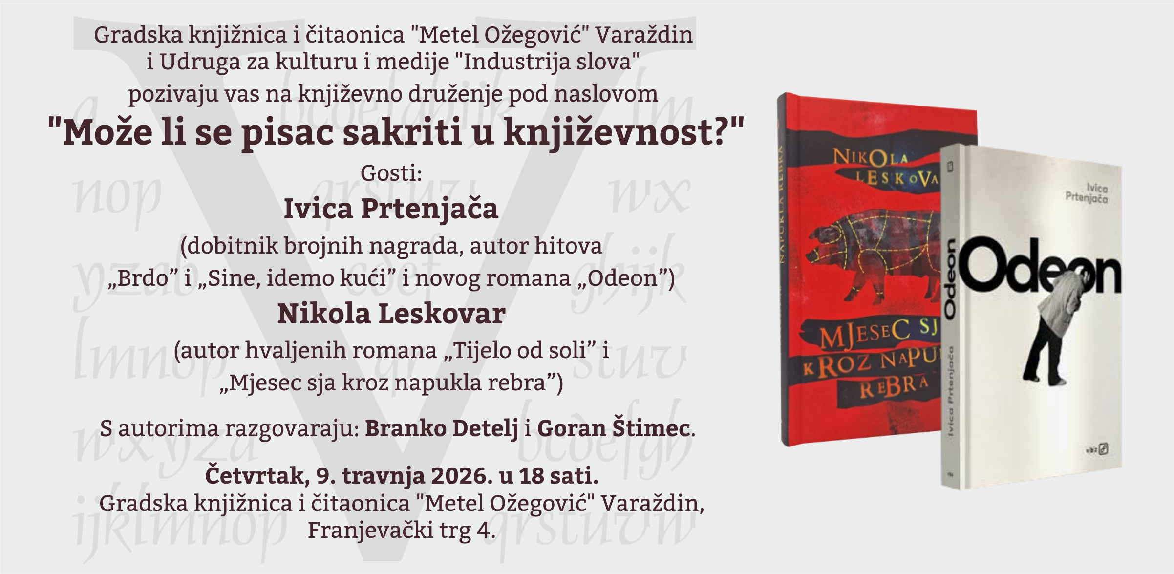 Udruga za kulturu i medije "Industrija slova" i Gradska knjižnica i čitaonica "Metel Ožegović" Varaždin pozivaju vas na književno druženje pod naslovom "Može li se pisac sakriti u književnost?" Je li tekst za autora siguran zaklon ili mjesto neizbježnog razotkrivanja? Kao čitatelji, tražimo li u knjigama autore ili sami sebe? O granicama između zbilje i fikcije, pisanja i bježanja, govore dvojica vrsnih suvremenih autora: Ivica Prtenjača (dobitnik brojnih nagrada, autor hitova „Brdo” i „Sine, idemo kući” i novog romana „Odeon”) i Nikola Leskovar (autor hvaljenih romana „Tijelo od soli” i „Mjesec sja kroz napukla rebra”). S autorima razgovaraju Branko Detelj i Goran Štimec. Četvrtak, 9. travnja 2026. u 18 sati, Gradska knjižnica i čitaonica „Metel Ožegović” Varaždin, Franjevački trg 4.